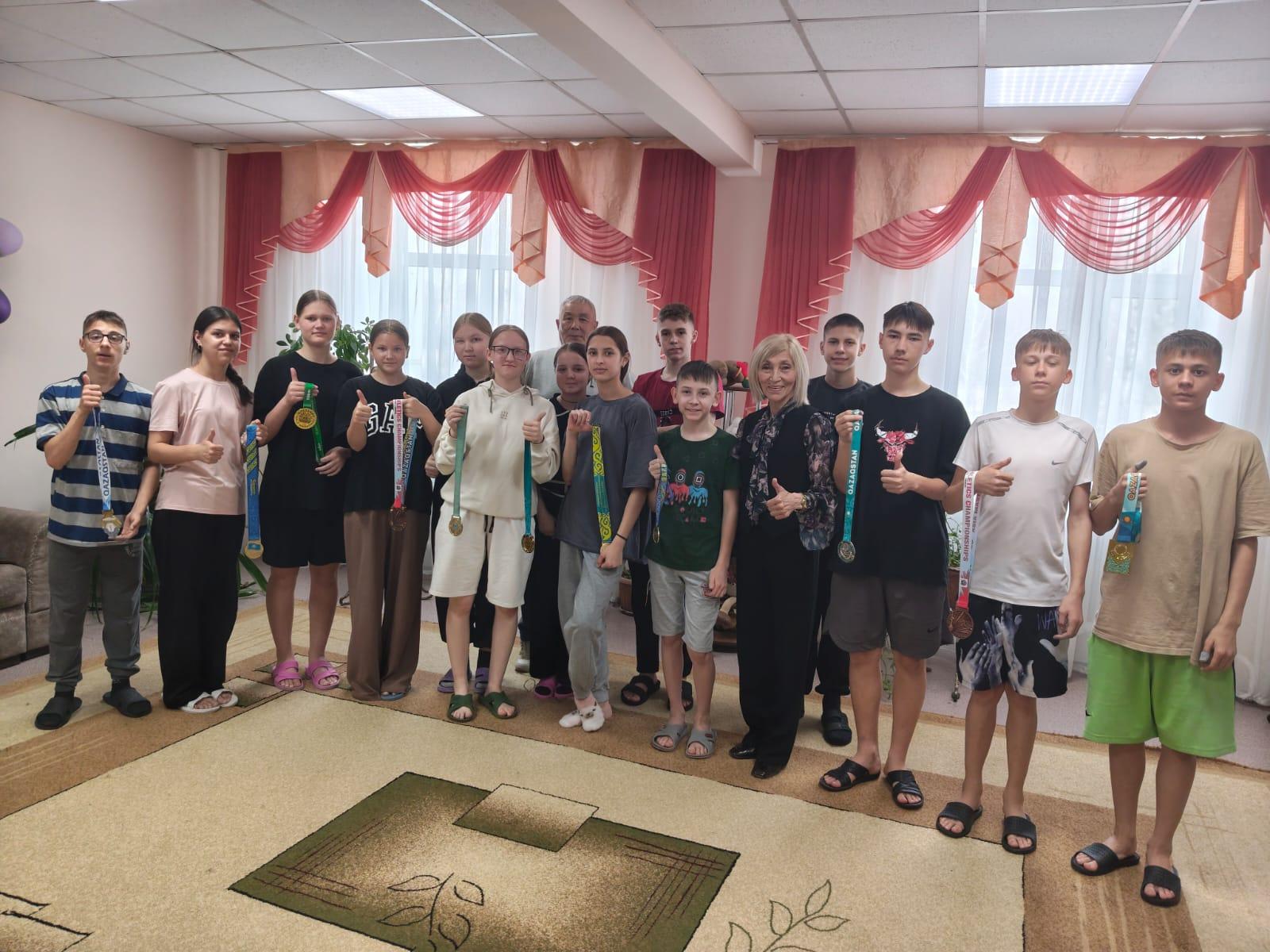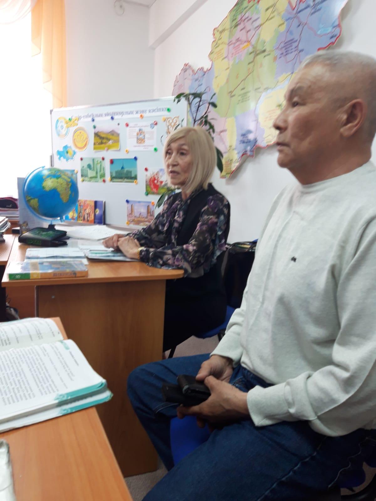Это Кыпчакбаев Айтбай и Сагатаева Зауреш. Они организовали встречу выпускников класса в родном детском доме. Наши гости пообщались с одной группой детей. Они рассказали о своем детстве, вспомнили учителей, друзей и яркие события, которые остались в их памяти на 50 лет. Наши дети показали свои комнаты, рассказали о своих увлечениях и учебе. Гости были поражены, увидев поделки, картины и цветочные композиции. Ксения провела мастер-класс по рекламе косметики. Гости подарили детям вкусные пасхальные пирожные. На память все сфотографировались с медалями Зауреш с соревнований по легкой атлетике.